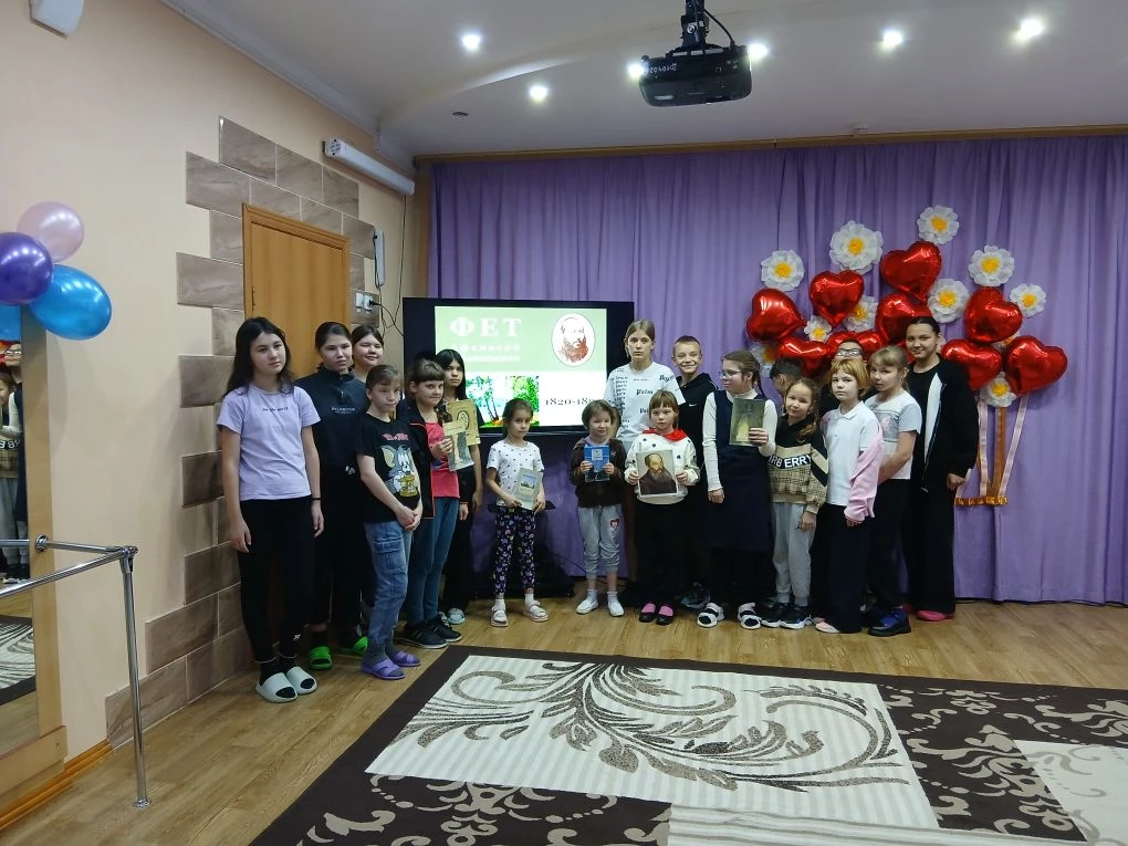 Дети с удовольствием послушали песни и романсы, написанные на стихи Фета, погрузившись в атмосферу его поэтического мира. Чтобы закрепить полученные знания и проверить свою эрудицию, ребята приняли участие в познавательной викторине «Его прозванье Фет». Завершилось мероприятие чтением стихов А.А. Фета в исполнении воспитанников СРЦ.