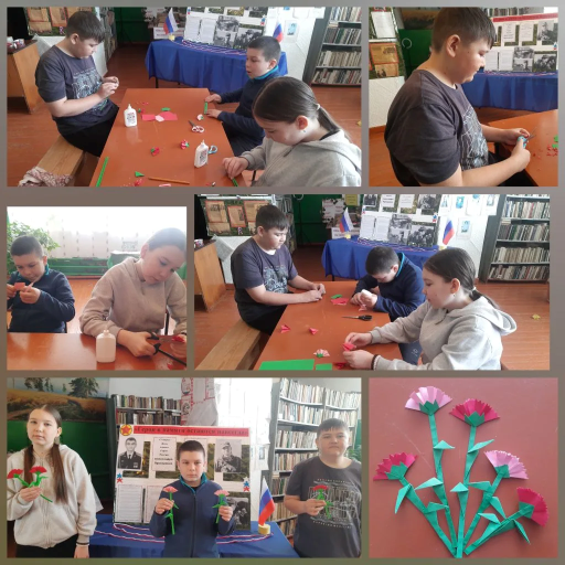 В конце мероприятия библиотекарь провела мастер- класс по изготовлению цветка - гвоздики. Гвоздика - цветок, который олицетворяет кровь, пролитую в боях, и символизирует героизм тех, кто сражался за мир.